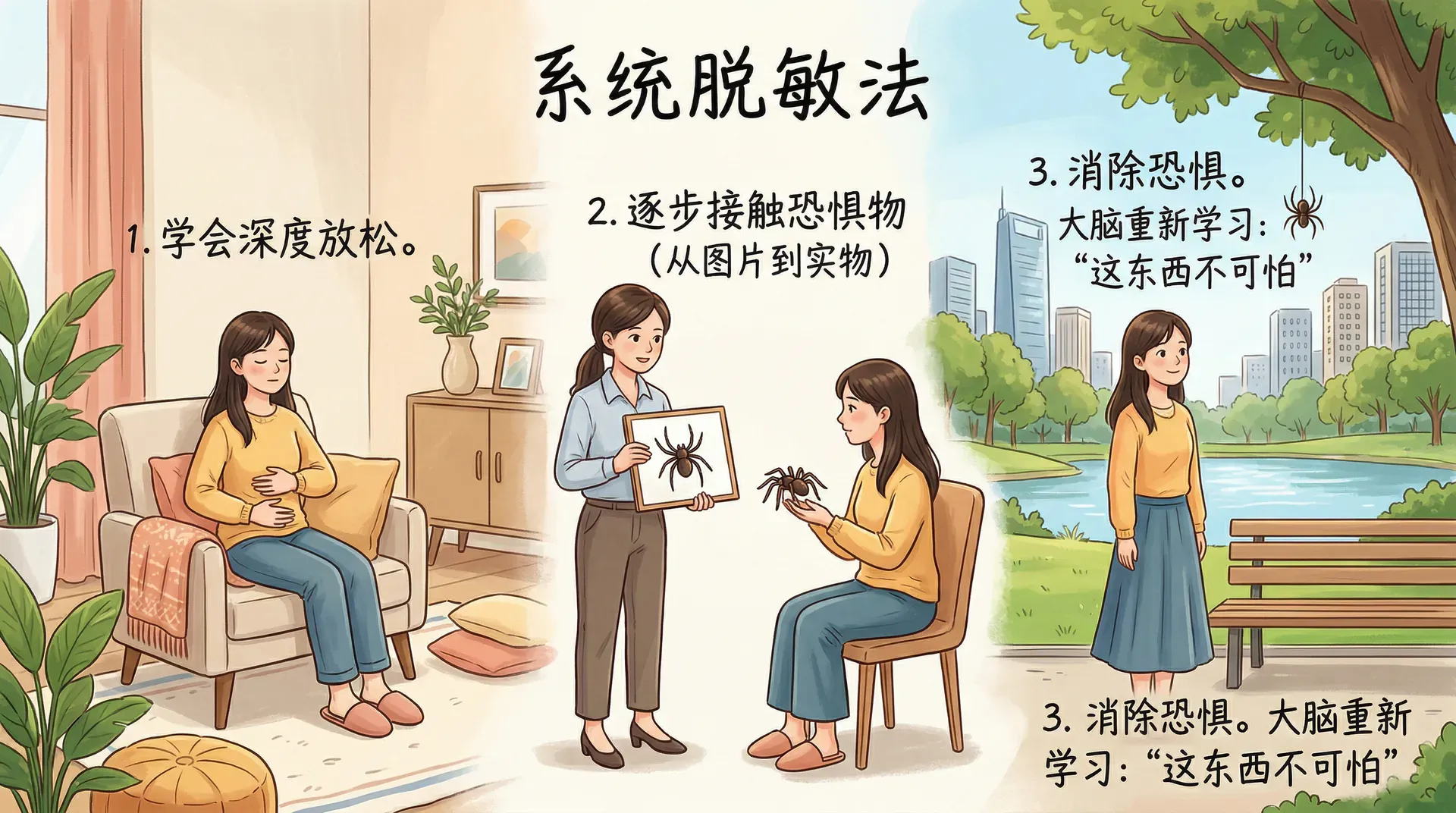 系统脱敏法的精髓在于“渐进”和“放松”。不是强迫直面恐惧,而是在安全、可控的环境中,一点点打破恐惧与刺激物之间的联系,让大脑重新学习新的情绪反应。