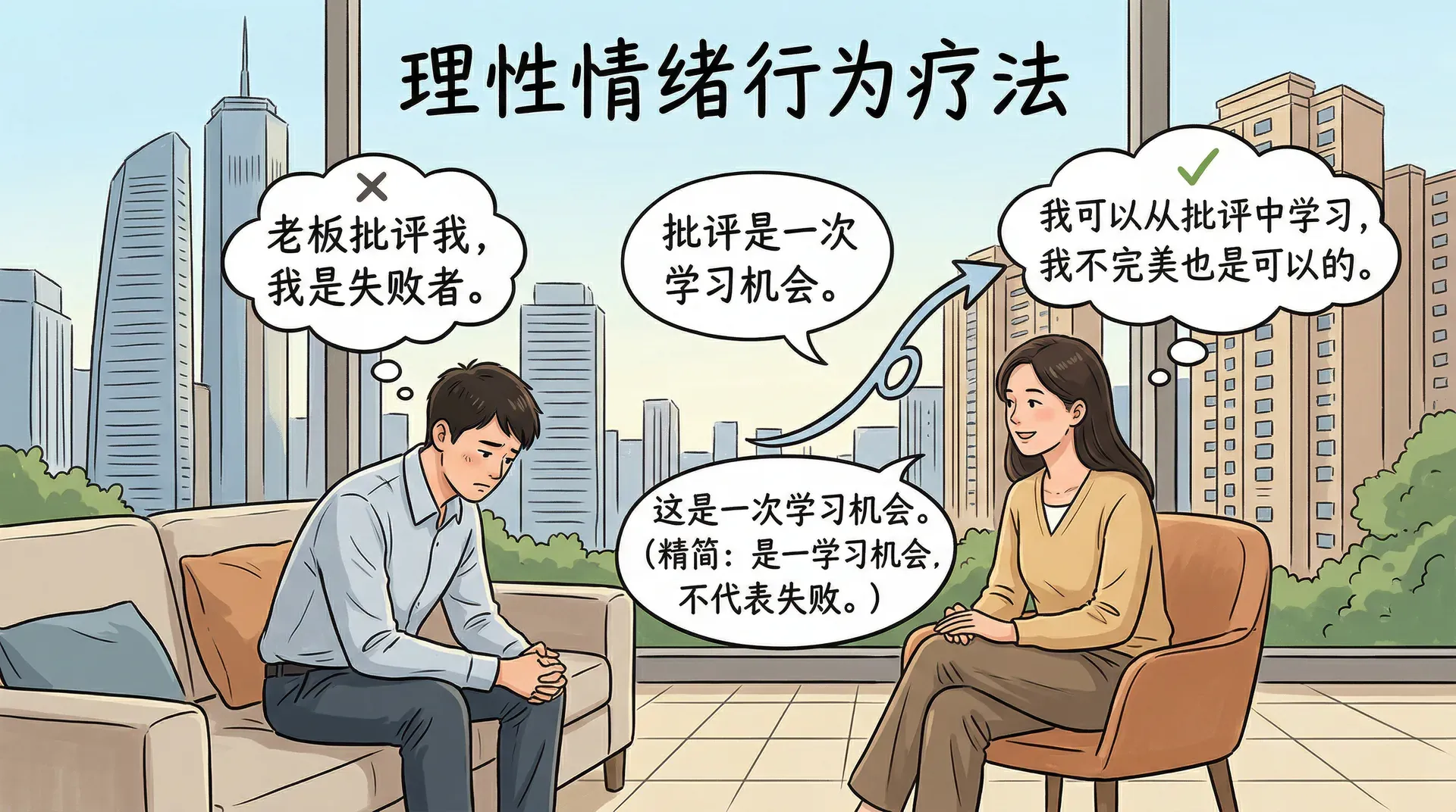 治疗师帮她识别出核心的非理性信念:“我的工作必须完美无缺,否则我就是无能的。”然后开始一系列提问:什么叫完美?有客观标准吗?即使作品有小瑕疵,就能证明你无能吗?你见过真正完美无缺的作品吗?