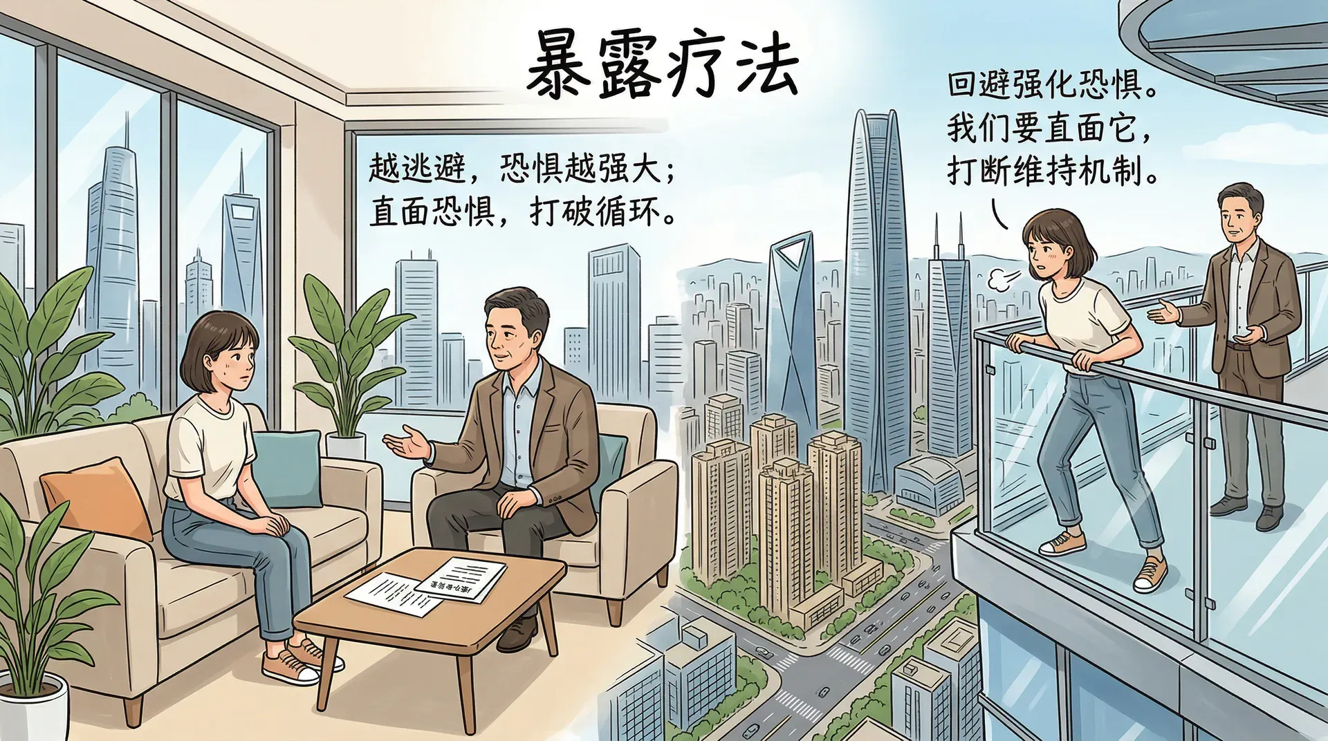 当人处于极度恐惧中,身体的应激反应会达到顶峰——心跳狂飙、呼吸急促、满身大汗。但这种生理反应不可能无限持续,人体有自我保护机制。通常二十到四十分钟后,即使刺激物还在,恐惧感也会自然下降,生理上进入“习惯化”状态。这个过程中,大脑会重新学习:“其实没那么可怕,我没有死掉,天也没塌下来。”这种深度的认知重建,往往一次就能产生非常显著的效果。