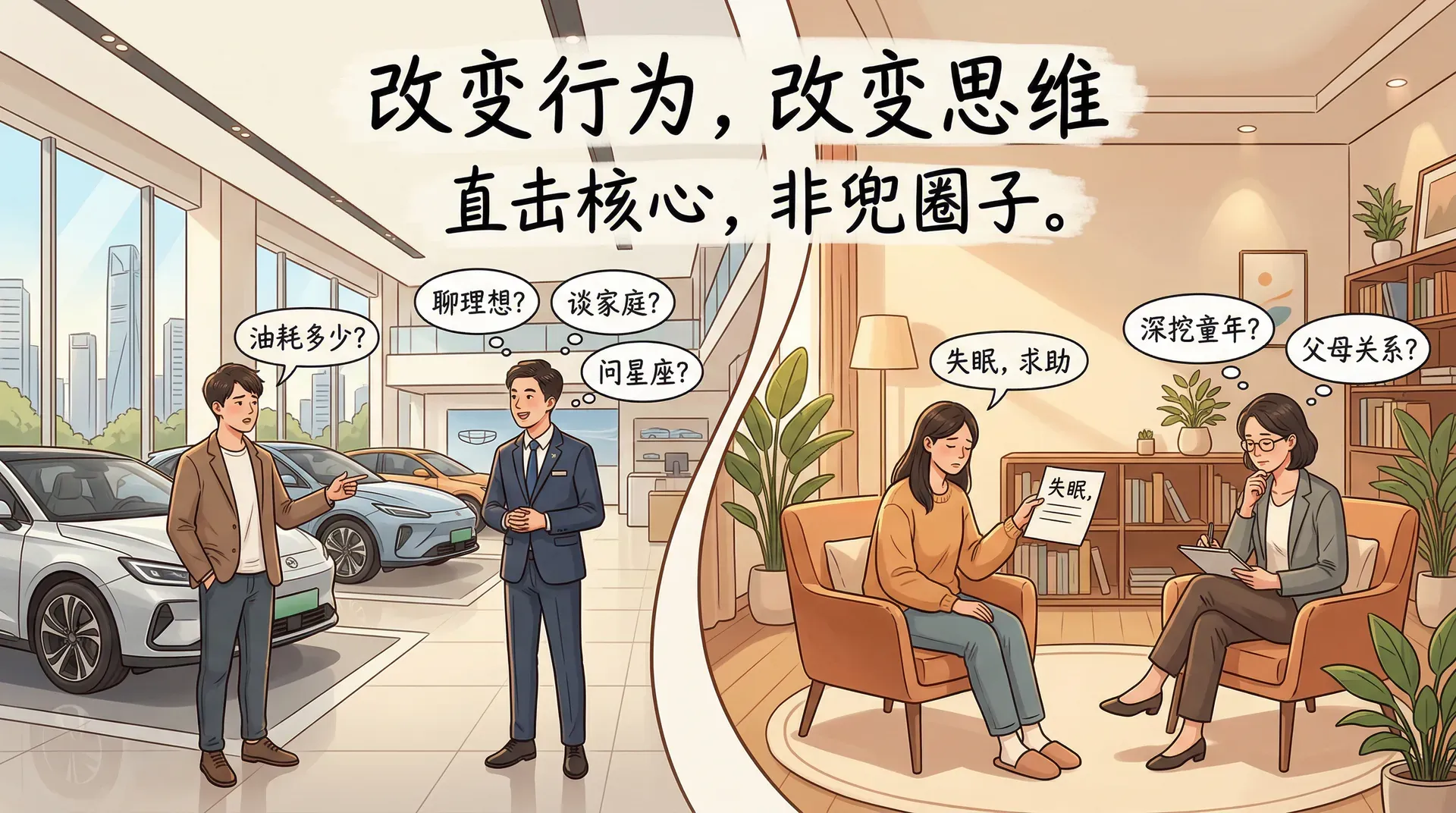 走进4S店看车时,销售顾问往往不会直接回答“这车油耗多少”,而是先聊人生理想、家庭状况,甚至问星座。这种绕圈子的做法,就像某些心理治疗——你因失眠求助,治疗师却要深挖童年和父母的关系。现代心理学界一直在批评这种现象:治疗应该直击问题核心,而非在枝节上兜圈子。
