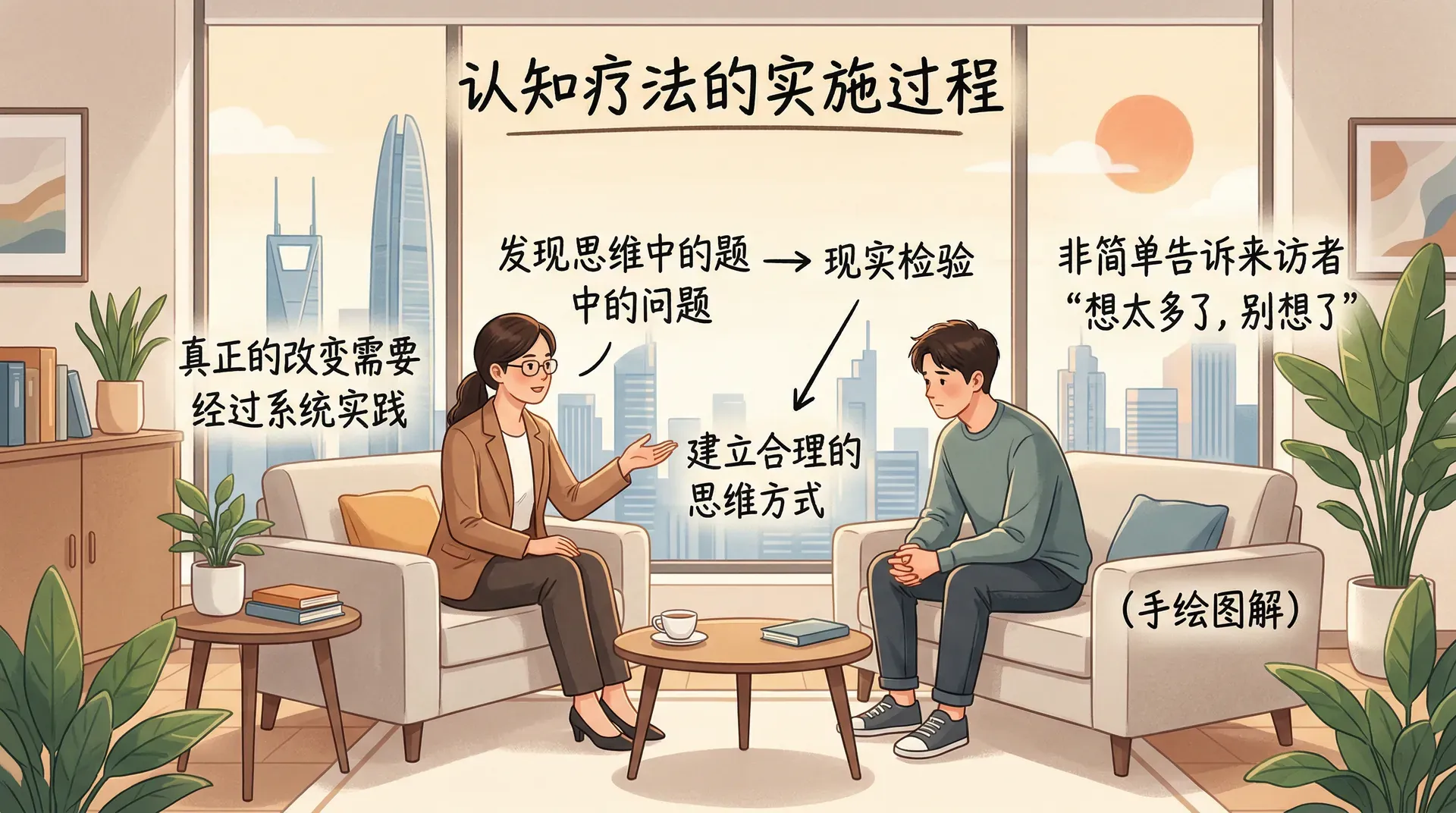 了解认知扭曲只是开始,真正的改变需要经过一套系统的实践过程。认知疗法不是简单地告诉来访者“你想太多了,别想了”,而是通过有结构的对话和练习,帮助来访者自己发现思维中的问题,并在现实检验中建立更合理的思维方式。