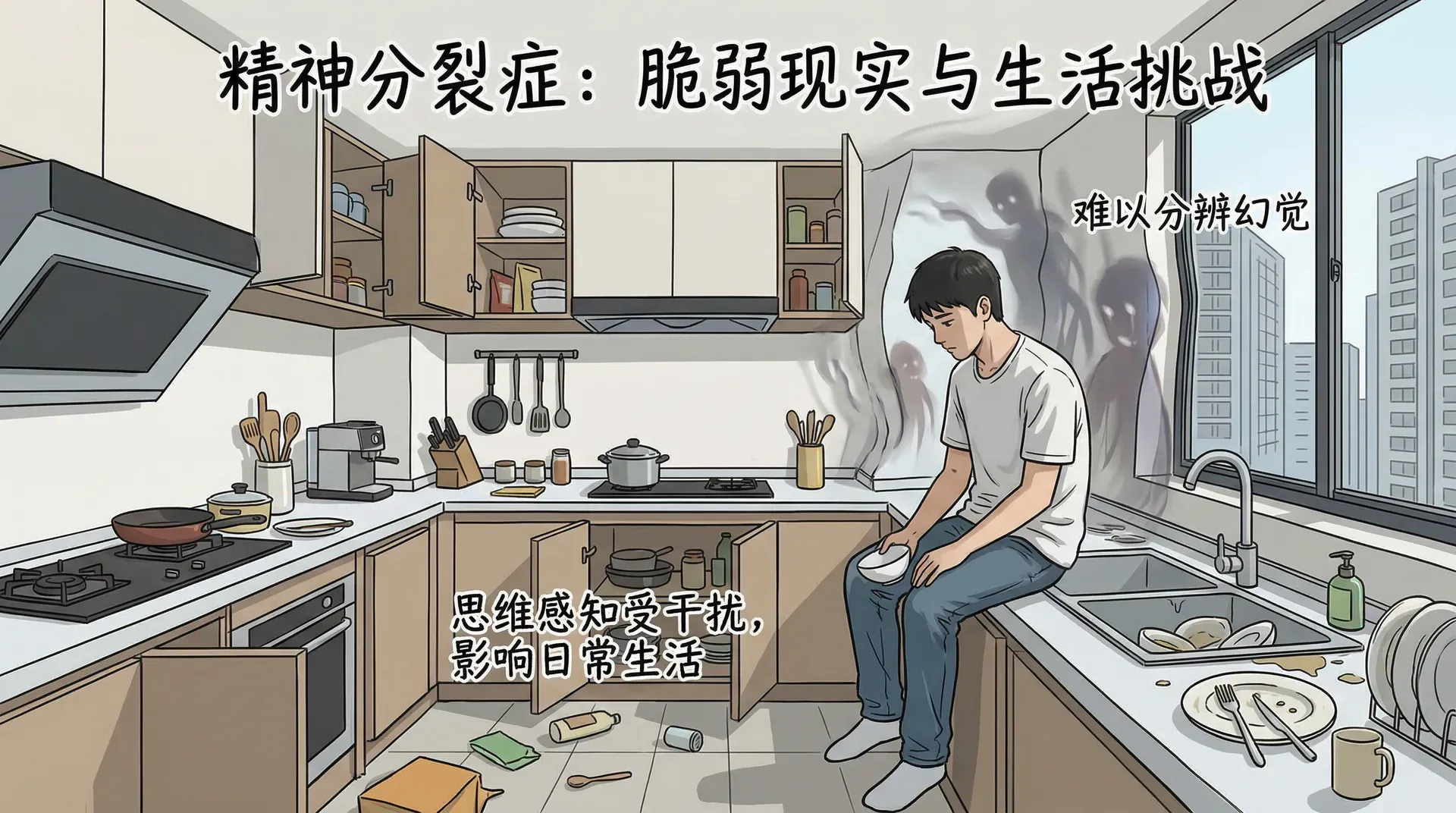 精神分裂症是最具挑战性的精神病性障碍,它让患者与现实世界的联系变得脆弱甚至断裂。患者无法分辨哪些声音是真实的,哪些是大脑制造的幻觉,生活变得异常艰难。精神分裂症不仅影响患者的思维和感知,还会深刻影响日常生活能力。有些患者无法照顾自己的基本生活需求,如按时吃饭、保持个人卫生或维持基本社交,这是因为疾病严重干扰了他们的认知功能。