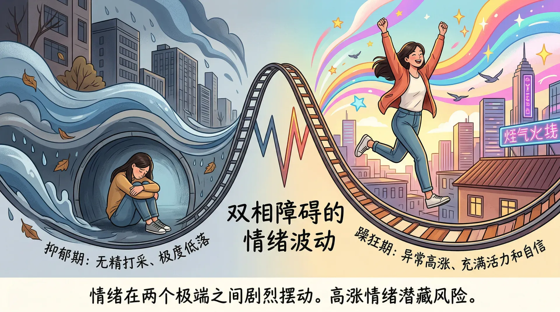 双相障碍就像是坐过山车——情绪在两个极端之间剧烈摆动。患有双相障碍的人会经历截然不同的两种状态:抑郁期和躁狂期。在抑郁期,他们表现出与抑郁症患者相似的症状;而在躁狂期,他们的表现则完全相反——情绪异常高涨,充满活力和自信。但躁狂期的高涨情绪并不等于真正的快乐,往往潜藏着巨大的风险。