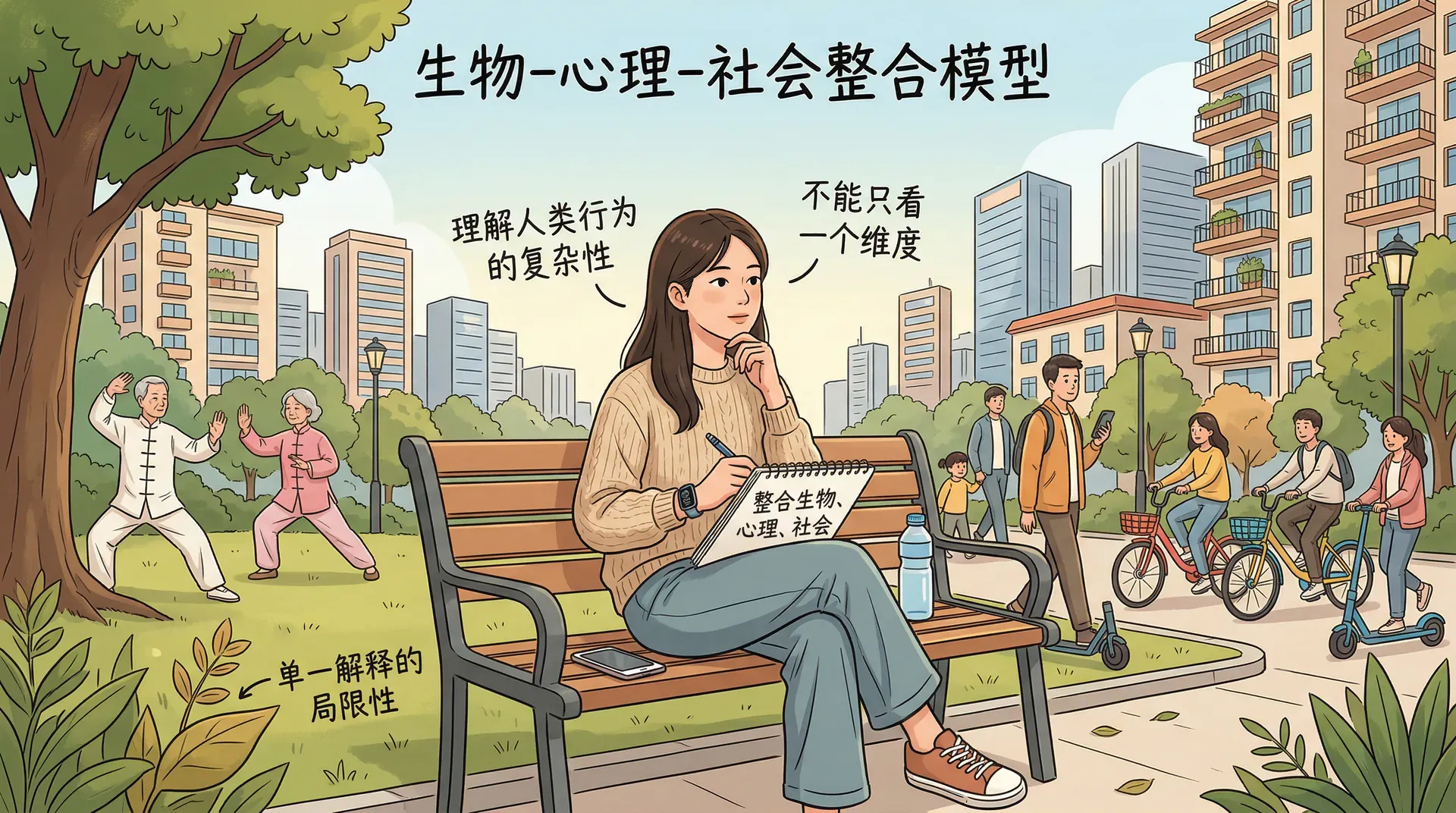 既然有这么多理论视角,又该如何整合?生物-心理-社会模型提供了一个框架,认为要真正理解一个人的行为和心理过程,必须同时考虑生物、心理和社会三个层面的因素,而不能只盯着其中一个维度。这个模型承认人类经验的复杂性,也对单一解释的局限性保持清醒的认识。