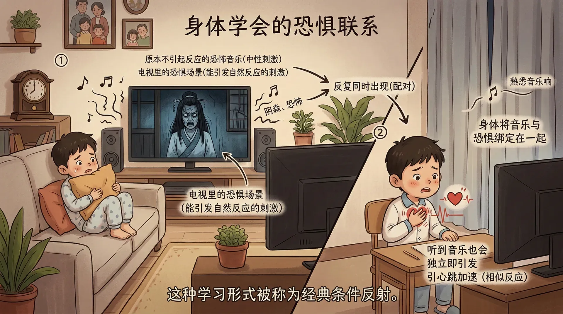 回到开篇的恐怖电影场景,恐怖音乐响起时心跳加速,并不是什么神秘反应,而是身体学会了在两个环境事件之间建立联系的结果:音乐与视觉恐惧场景反复同时出现,身体便将二者绑定在了一起。这种学习形式被称为经典条件反射——原本不引起反应的中性刺激,通过与能自然引发反应的刺激反复配对,最终也能独立引发相似的反应。