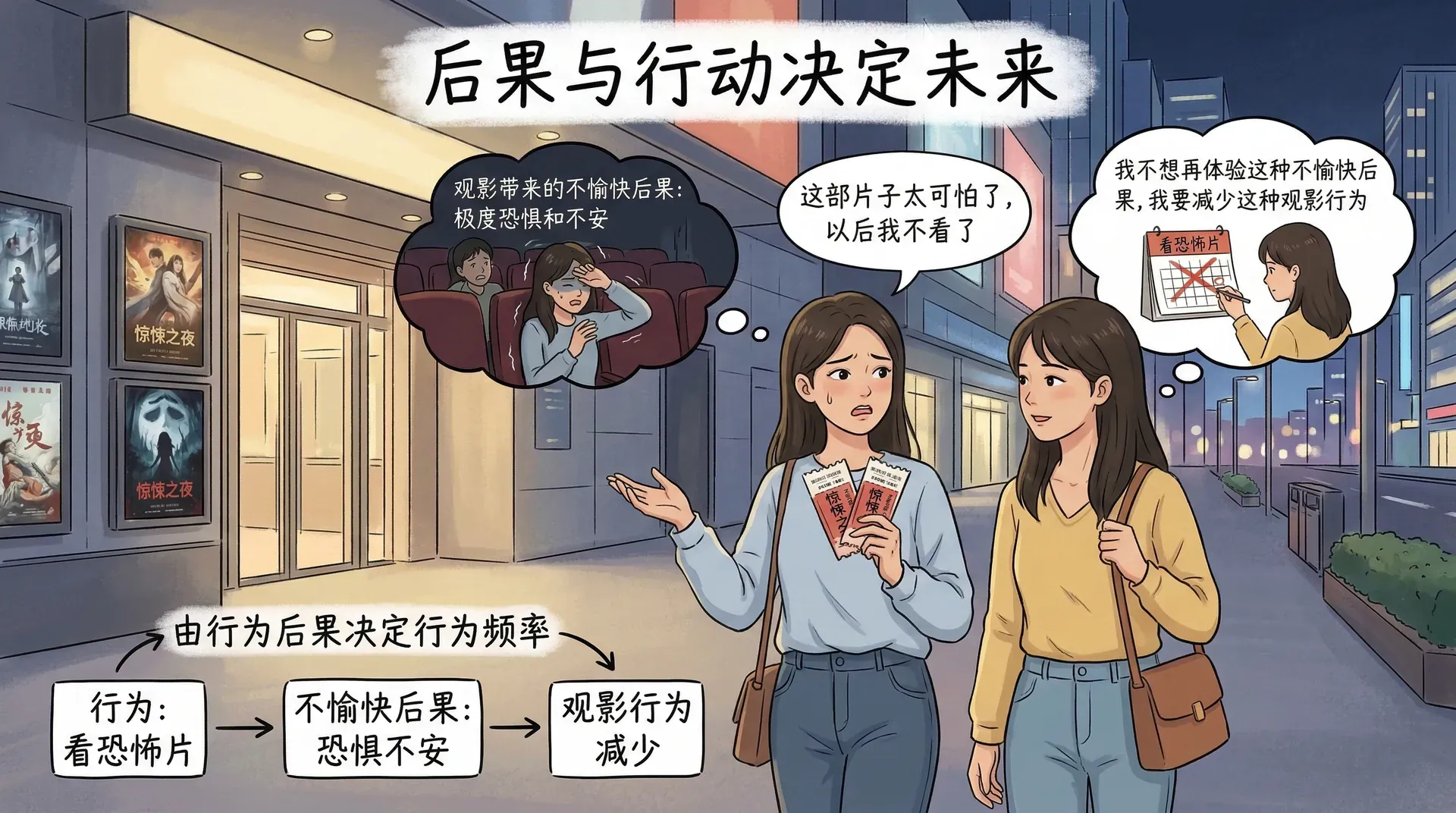 回到开篇那场恐怖电影:你选择走进影院,是因为朋友的推荐让你预期会有不错的体验,这是观察学习在发挥作用;即便换了一条路,你依然找到了影院,因为脑中存有那片区域的认知地图;电影放映过程中,恐怖音乐与惊吓场景的反复同时出现,让你的心跳对音乐产生了条件反射;散场后你暗自决定,以后再也不来了——这是操作性条件反射中惩罚效应的体现。一次普通的观影经历,悄然交织着多种不同的学习机制。