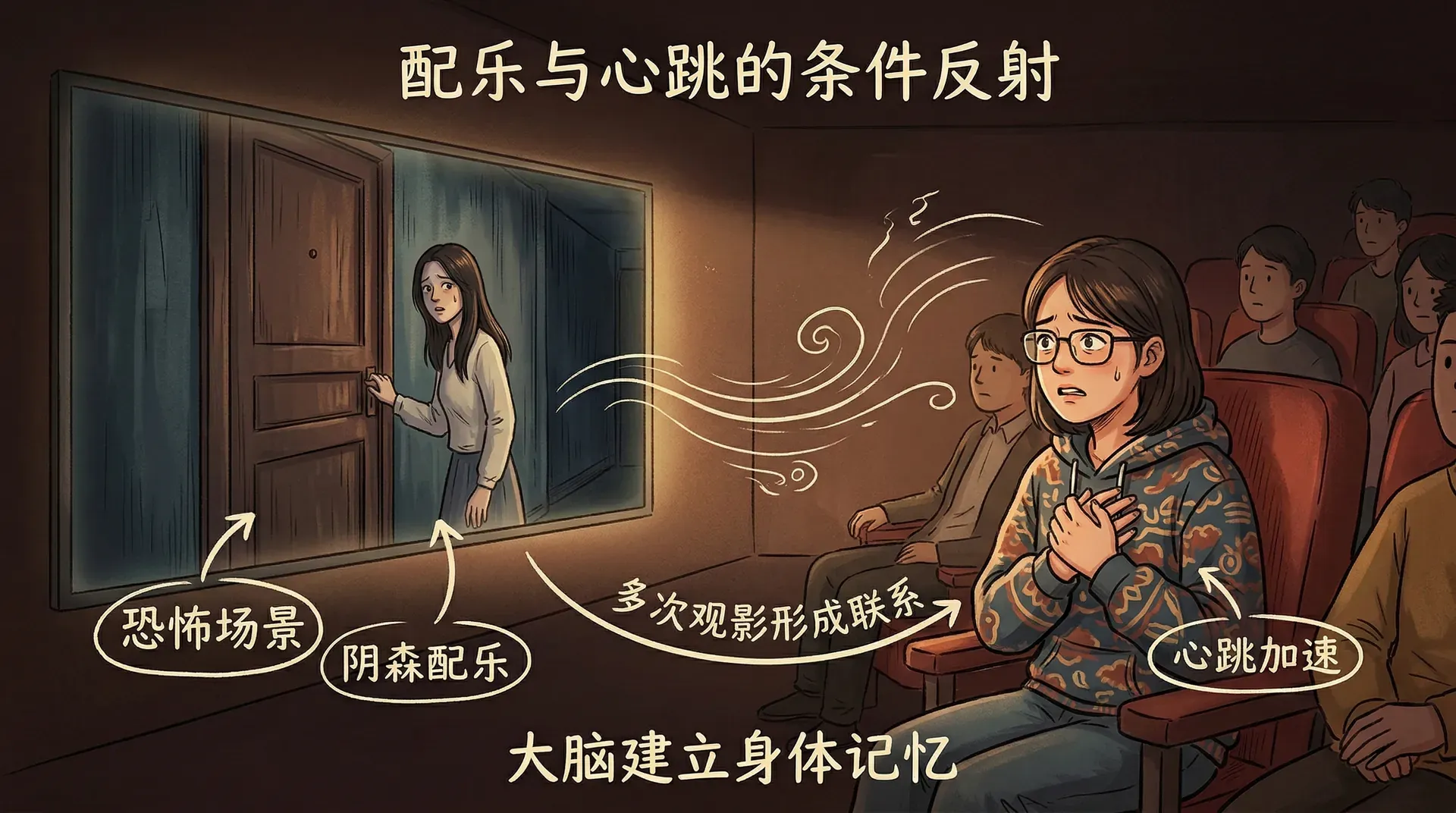 坐在电影院看恐怖片时,每当主角走向紧闭的门,阴森的配乐骤然响起,心跳便会不自觉地加速。这种反应并非偶然——在多次观影之后,大脑已悄悄将特定的音乐与紧张的视觉场景联系在了一起,形成一种无需刻意思考便能触发的条件反射。