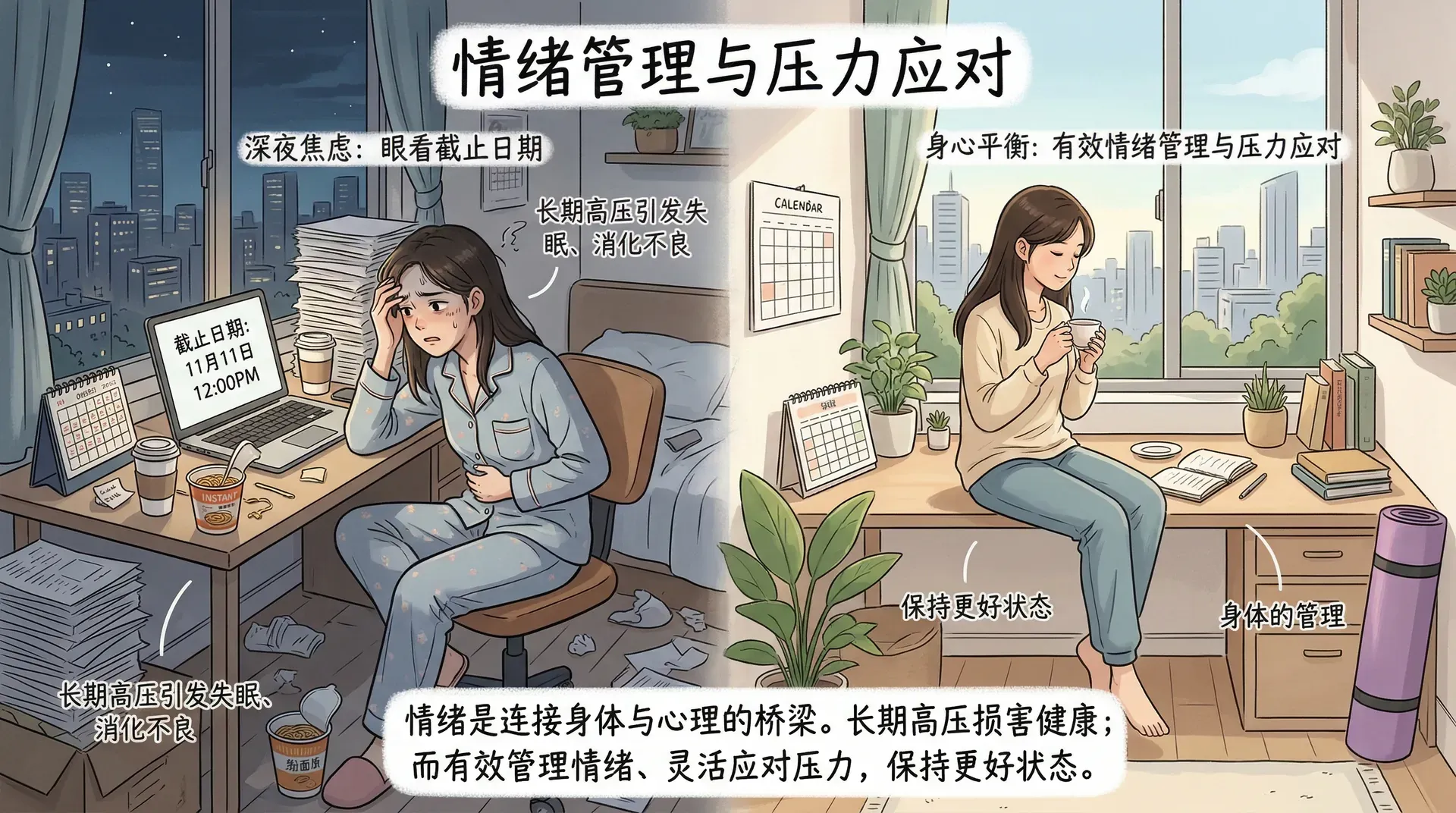 从诸事不顺的烦躁、收到录取通知书的激动,到深夜独自面对截止日期时的焦虑,这些情绪体验构成了我们生活最鲜活的底色。表面看似简单的情绪反应,背后却隐藏着复杂的心理机制。现代心理学研究表明,情绪、压力与健康三者之间存在深刻的相互作用——长期高压不仅影响心理状态,还会直接引发失眠、消化不良等身体症状;而那些能够有效管理情绪、灵活应对压力的人,往往在身心两方面都保持着更好的状态。