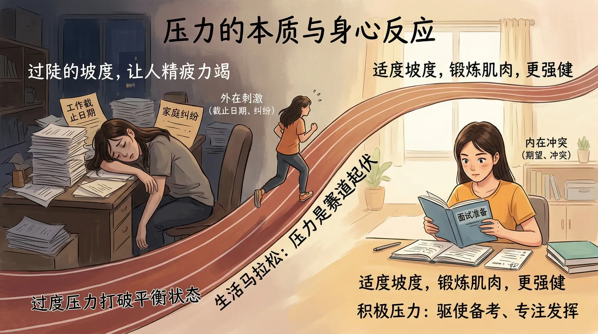 如果把生活比作一场马拉松,压力就像赛道上的起伏。适度的坡度能锻炼肌肉,让身体更强健;但坡度过陡或持续时间过长,则会让人精疲力竭。理解压力的运作机制,是学会与它和解的第一步。