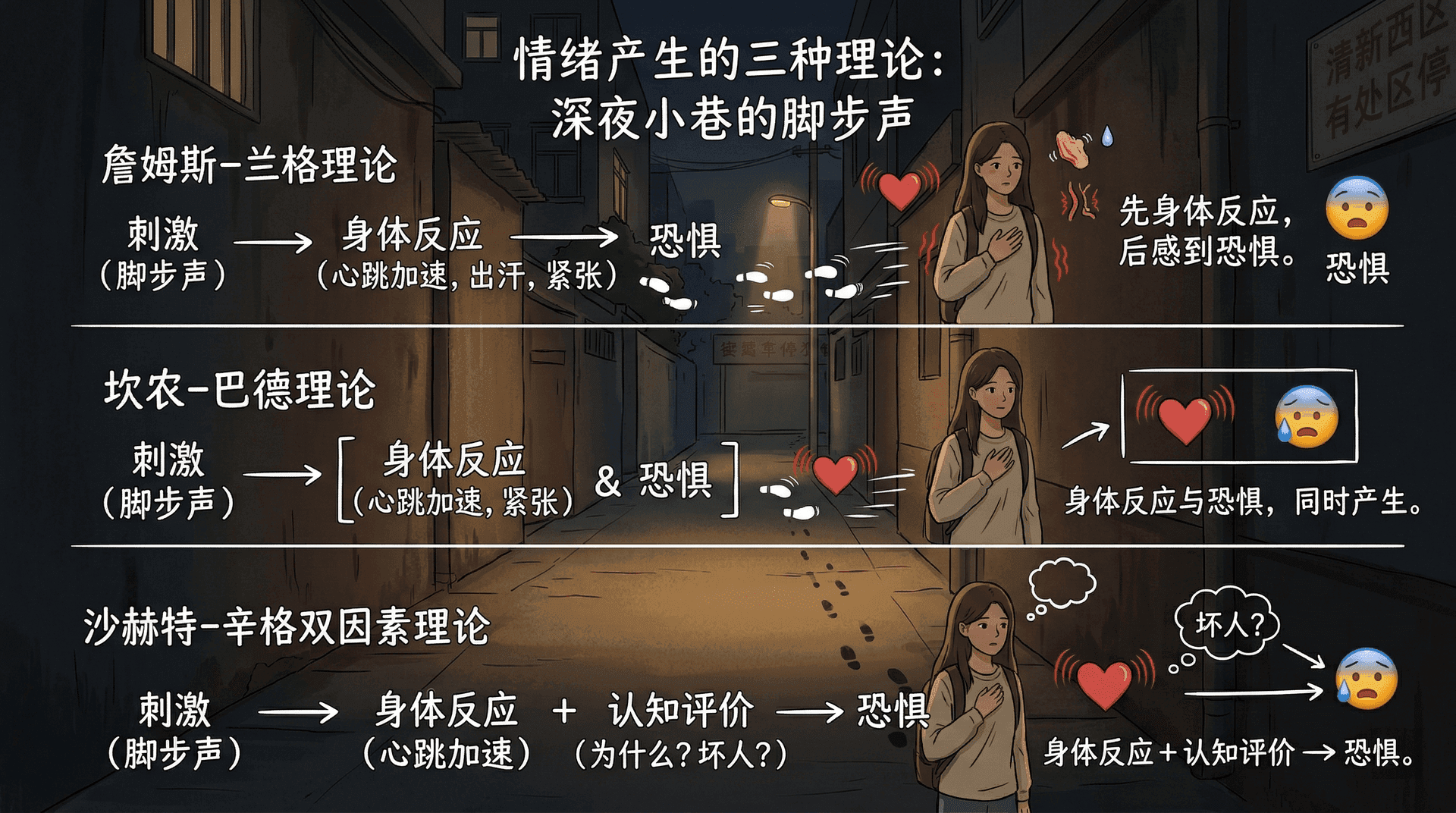 深夜独自走在小巷里,突然听到身后传来脚步声——是先心跳加速、手心出汗、肌肉紧张,然后才感到恐惧?还是先感到恐惧,身体才随之发生变化?这看似简单的问题,触及了情绪产生机制的核心,心理学家为此争论了一个多世纪,也由此发展出了几种影响深远的理论。