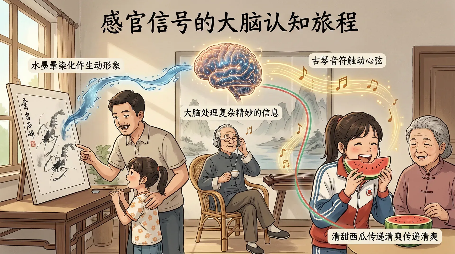凝视齐白石的《虾》时,那水墨晕染如何在大脑中化作生动形象?聆听《高山流水》的古琴声时,那些音符又是如何触动心弦?炎热夏日品尝一口清甜西瓜,那份清爽又是如何传递到感官世界的?这些日常体验背后,隐藏着大脑复杂精妙的信息处理机制。大脑如同一位身处暗室的指挥家,却能通过各种感官信号把握外界的精彩世界。