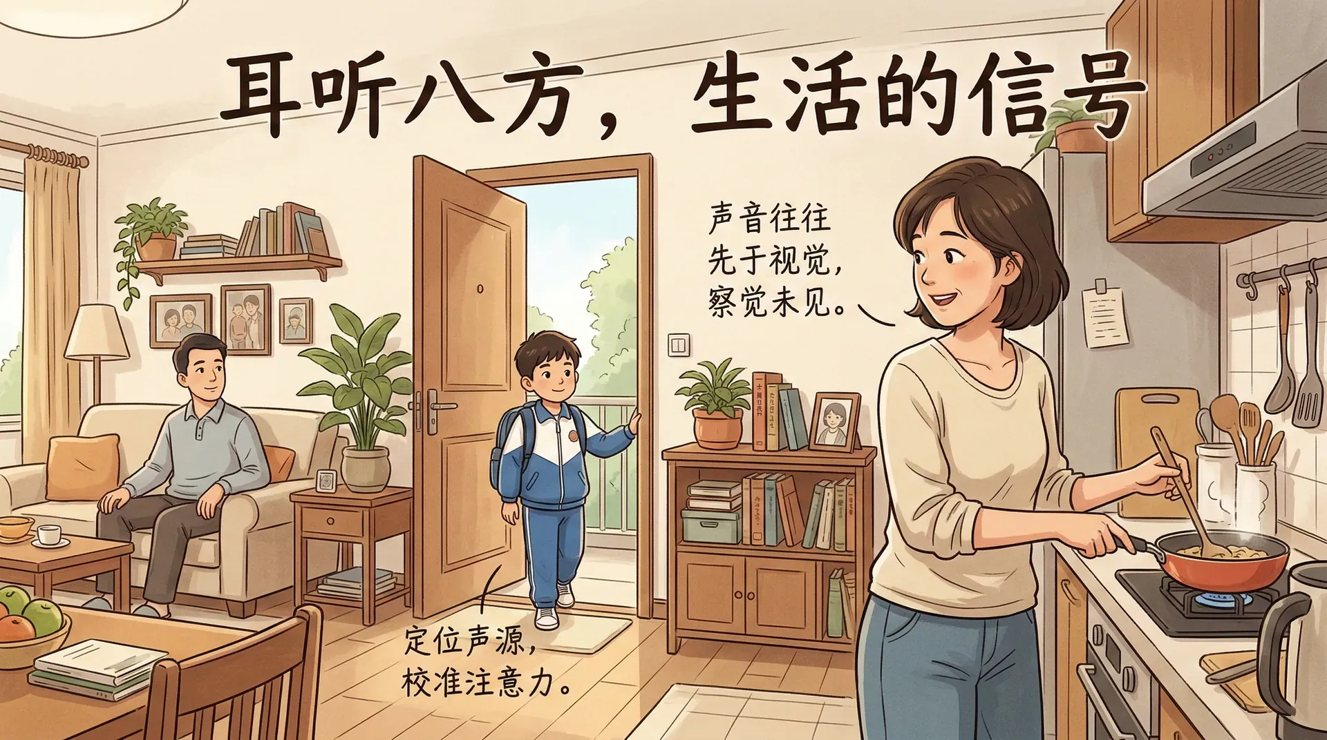 听觉与视觉的功能高度互补。声音往往先于视觉信号到达——身后传来的脚步声、门后的对话声,都是视觉无法捕捉而听觉能够先行察觉的信息。听觉系统不仅负责接收语言和音乐,更承担着在三维空间中定位声源、协助视觉系统校准注意方向的重要功能。