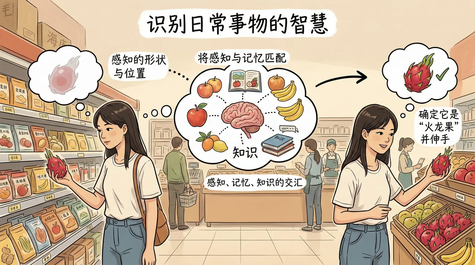 知觉组织过程完成之后,大脑已经知道视野中存在一个什么形状、处于什么位置的物体,但这还不足以指导行为。要对外界做出恰当反应,还需要识别——将当前感知到的内容与记忆中储存的知识匹配,从而确定“这是什么”。识别与认知是感知过程的最终阶段,也是感知与记忆、知识相互交汇的地方。