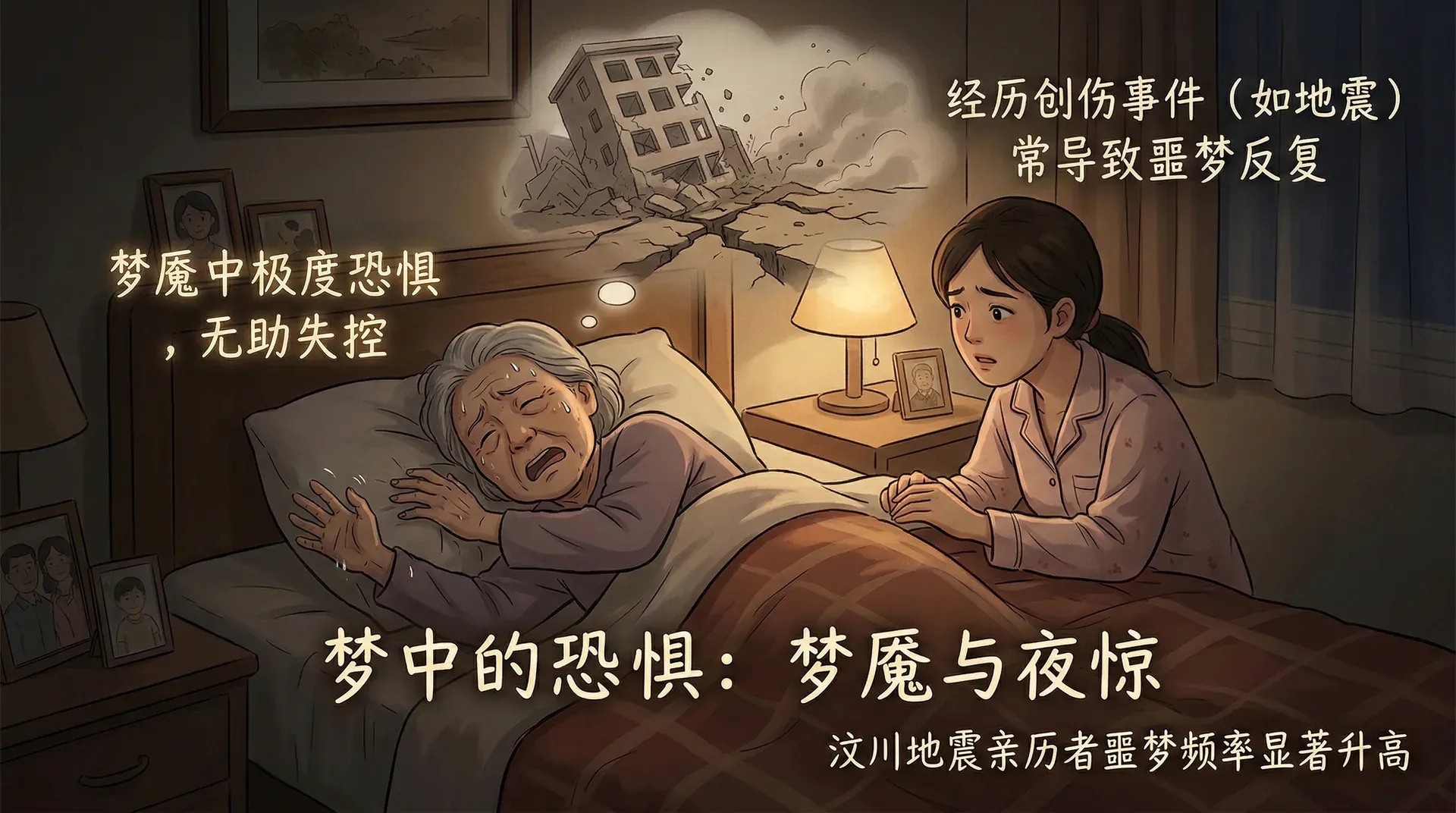 梦魇是指在睡梦中感到极度恐惧、无助或失控,并因此从睡眠中惊醒的体验。多数人每年会经历六到十次噩梦,女性略多于男性,高峰期在3至6岁之间。经历过重大创伤事件——如地震、意外事故——的人,常会出现反复重现创伤场景的噩梦。2008年汶川地震后的研究证实,亲历地震的学生做噩梦的频率显著高于未受影响的同龄人。