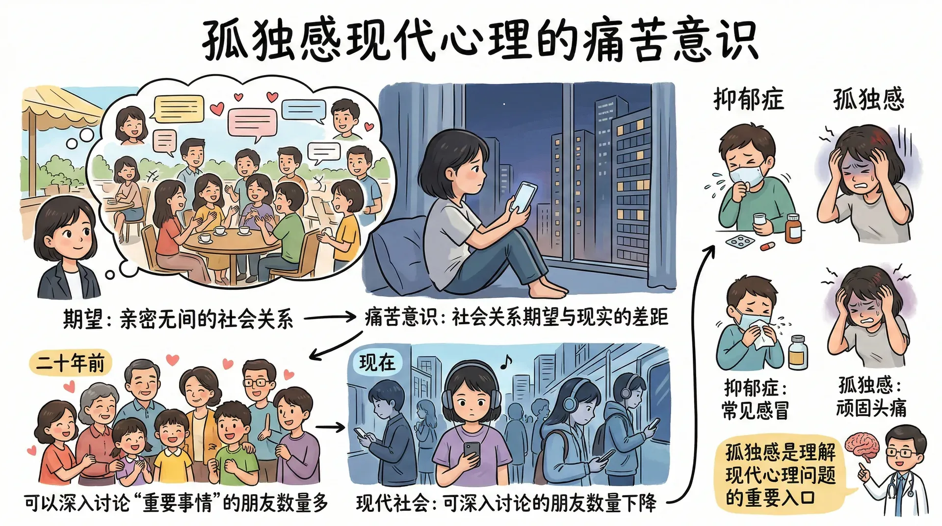 如果说抑郁症是心理障碍中的“常见感冒”,那么孤独感就是那顽固的“头痛”。孤独,无论是慢性的还是暂时的,都是一种对自身社会关系比期望中更少、更缺乏意义的痛苦意识。理解孤独的心理机制,是理解现代人心理健康问题的重要入口。在现代社会中,人们的亲密社会关系数量在持续减少,一项调查显示,在过去二十年中,人们可以深入讨论“重要事情”的朋友数量明显下降,且这一趋势在年轻群体中尤为明显。