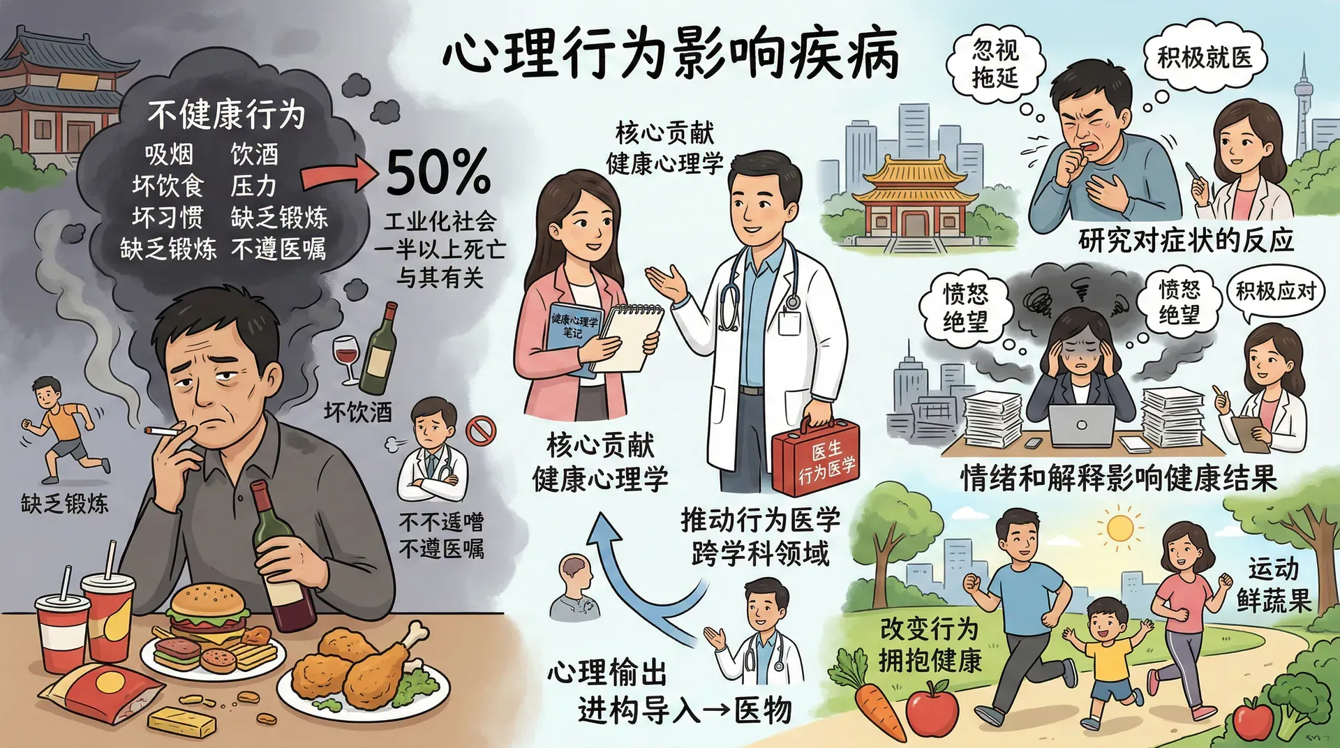 在工业化社会,至少一半的死亡与行为因素有关——与吸烟、饮酒、不健康饮食有关,与对压力的应对方式有关,也与缺乏锻炼和不遵从医嘱有关。研究和改变这些行为因素的努力,催生了一个名为“行为医学”的跨学科领域,而健康心理学正是心理学对这一领域的核心贡献。健康心理学家研究人们如何对疾病症状做出反应,以及情绪和解释方式如何影响健康结果。