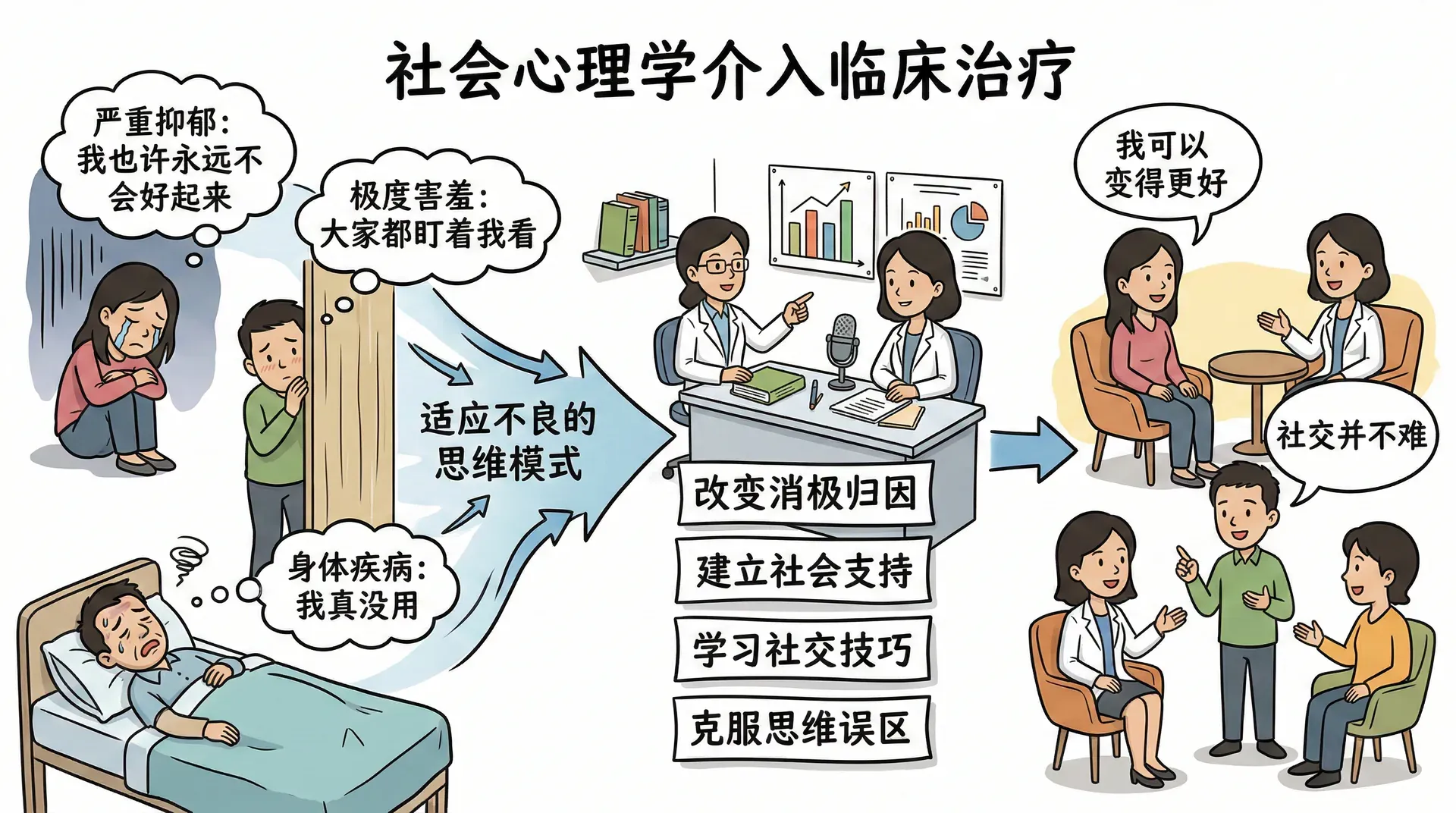 在应用社会心理学的众多领域中,有一个方向将社会心理学的概念与抑郁症联系起来,并延伸到孤独感、焦虑、身体疾病以及幸福感与心理健康等议题。这种连接社会心理学与临床心理学的研究,试图回答以下四个核心问题。