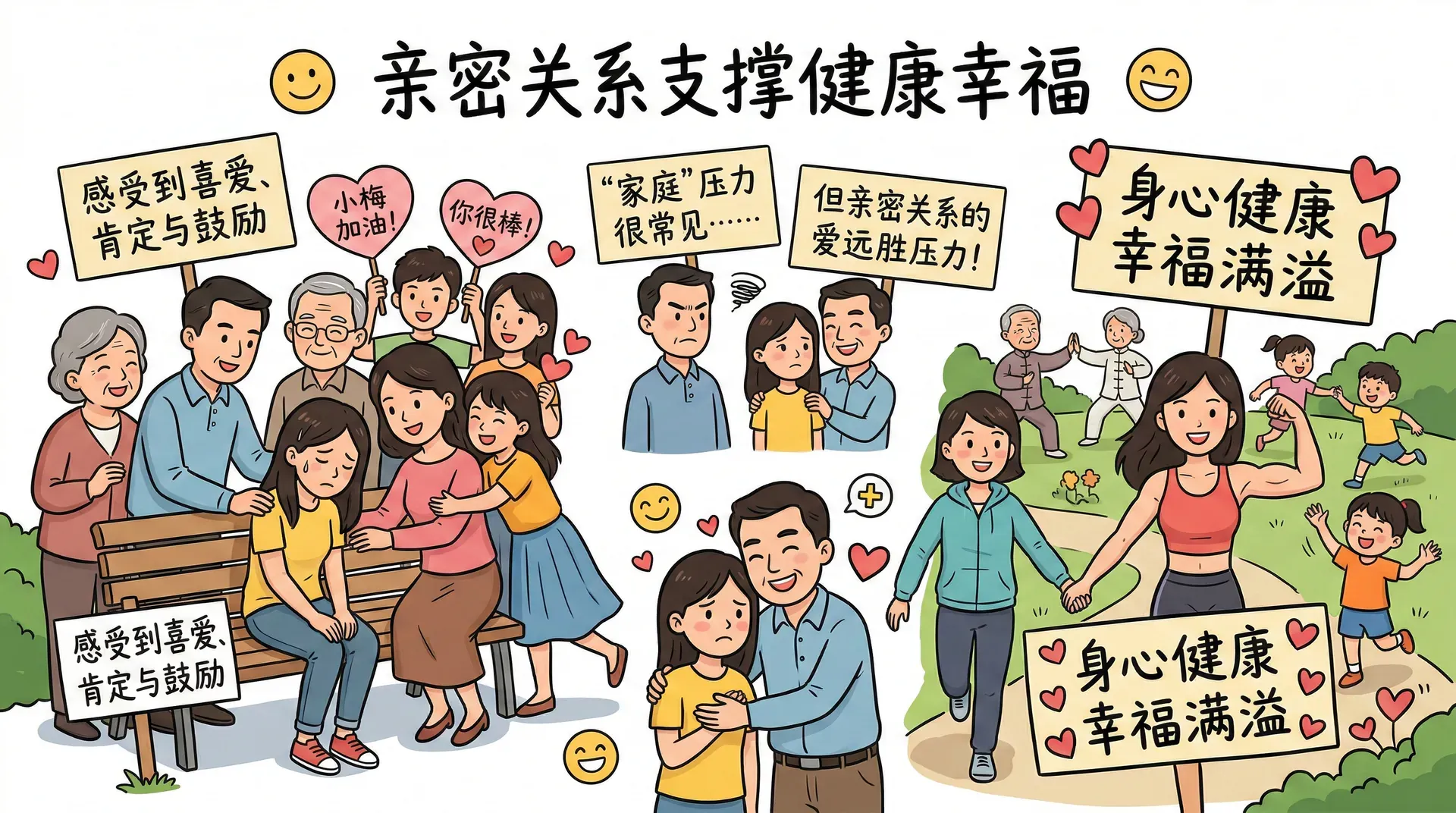 在心理健康与身体健康的研究中,还有一个核心议题:支持性的亲密关系——感受到亲密朋友和家人的喜爱、肯定与鼓励——能够显著预测健康状况和主观幸福感。人际关系中固然存在压力,“家庭”是成年人日常情感压力的最常见来源,但研究一致表明,亲密关系对健康和幸福的积极影响,远远大于其负面影响。