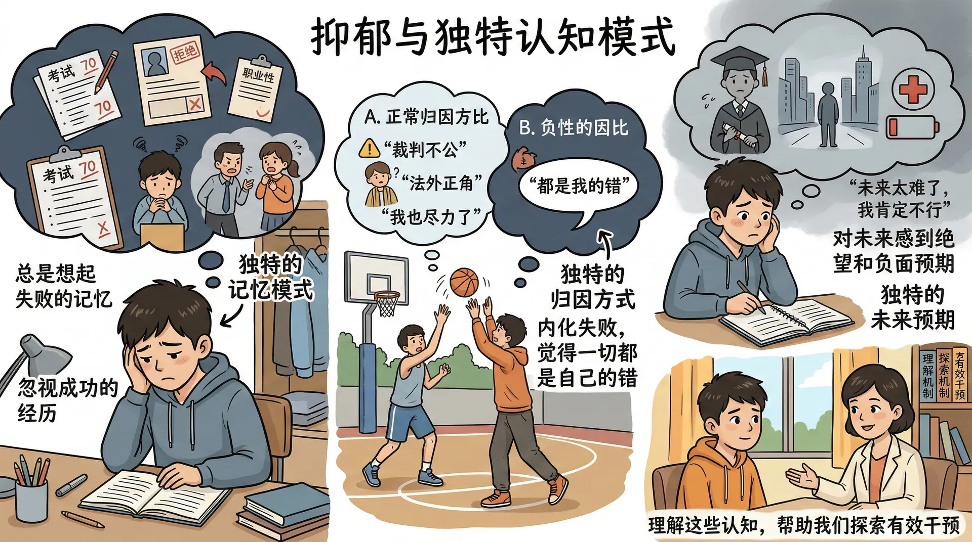 研究人员发现,抑郁患者的消极自我认知、错误归因和悲观预期,形成了一个恶性循环的关键环节。这个循环往往由学业失利、家庭矛盾或社交困难这类负面事件引发,继而产生抑郁情绪,进一步改变一个人思考和行动的方式,最终助长更多消极经历、自责和抑郁。