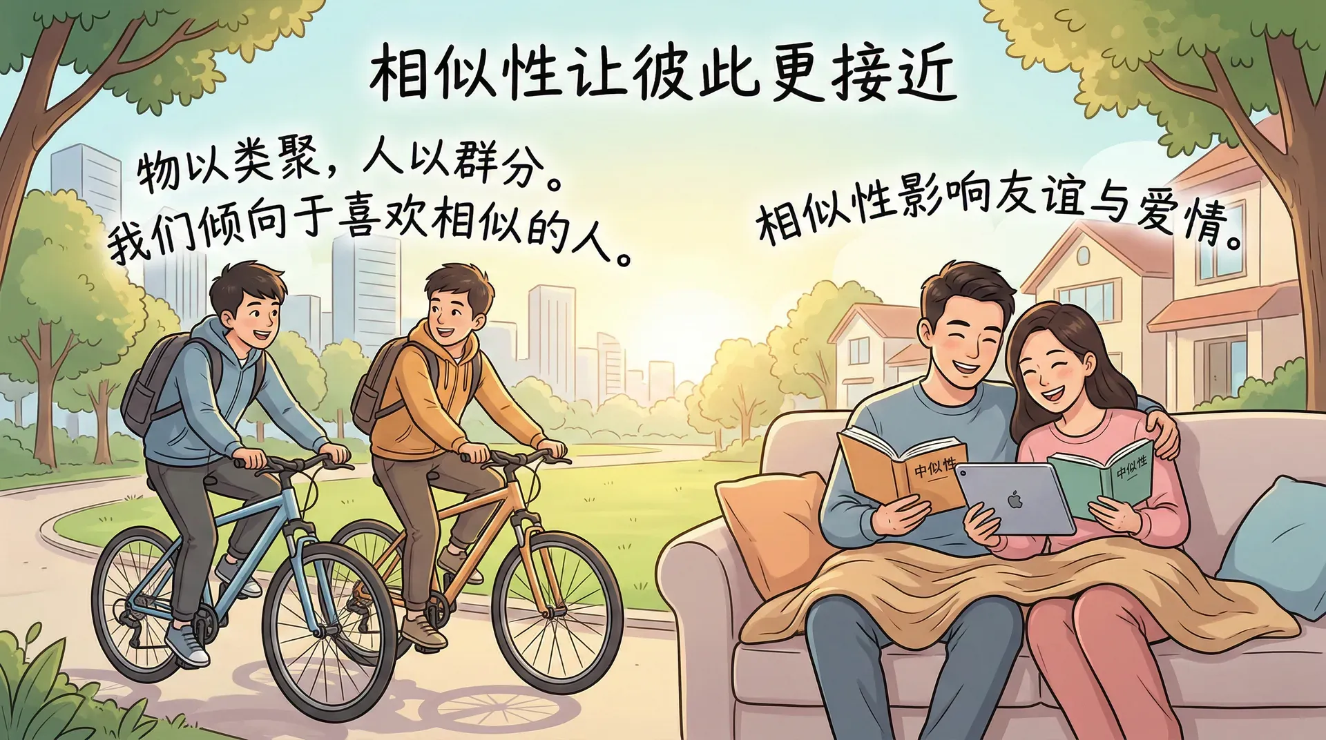 除了价值观,生活方式的相似性也是友谊和恋爱关系中的重要因素。早睡早起的人往往与作息规律相似的人更合得来;喜欢宅在家里的人通常与同样偏爱安静生活的人建立更深厚的友谊。在中国的婚恋市场上,相亲时双方往往会重点了解对方的教育背景、工作性质、收入水平、兴趣爱好等信息,这些其实都是在寻找相似性的体现。