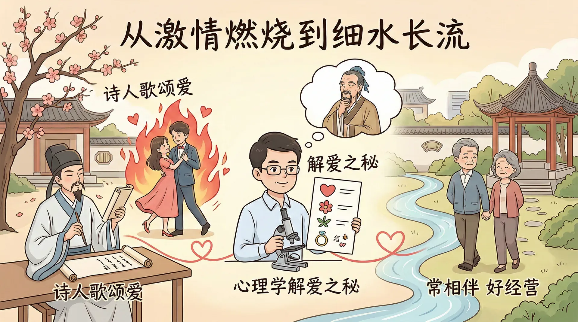 如果说激情之爱是烈酒,那么陪伴之爱就是温开水——看似平淡,却是生活的必需品。陪伴之爱建立在深度了解、相互信任和长期承诺的基础上,它不像激情那样轰轰烈烈,但却更加稳定和持久。“相濡以沫”、“举案齐眉”这些成语很好地诠释了陪伴之爱的精神内涵。
