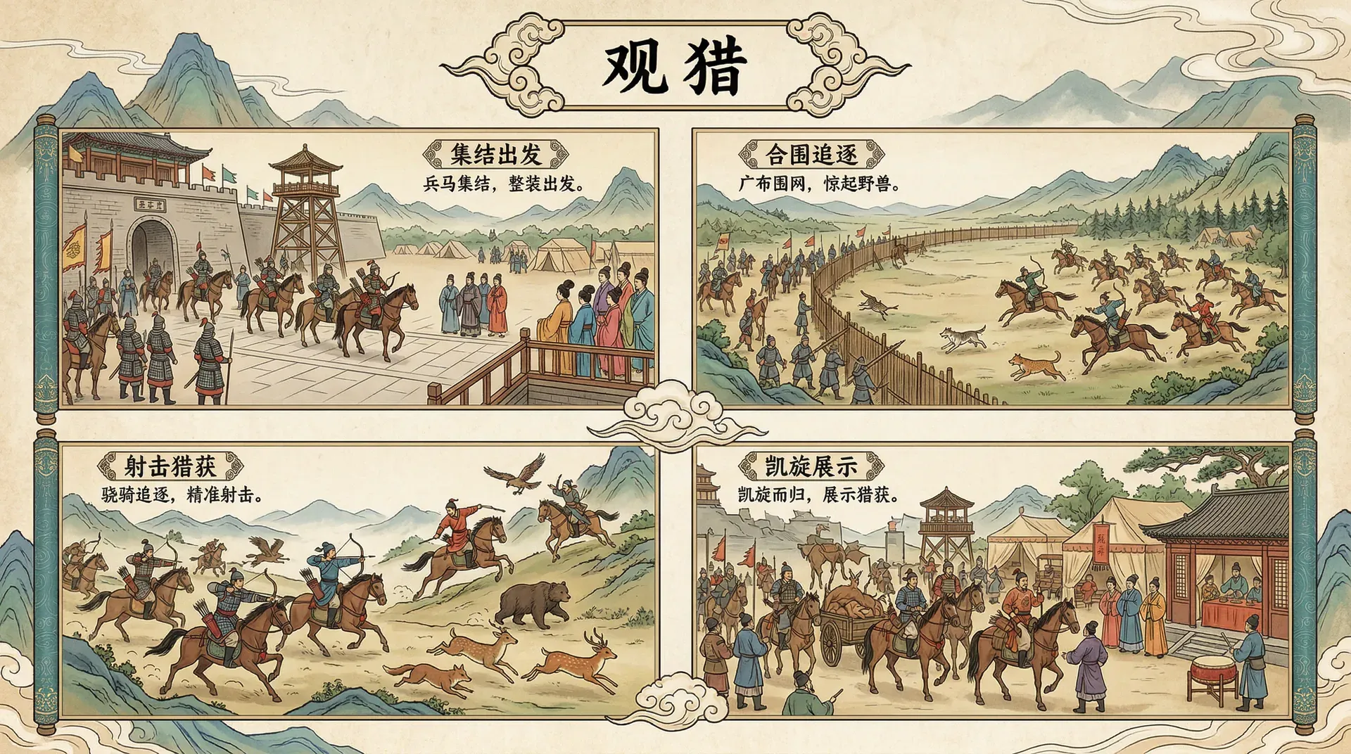 从更深一层看,这首诗也寄托了王维对建功立业、报效家国的渴望。唐代边塞诗风盛行,王维身处那个时代,同样免不了心中那份“宁为百夫长,胜作一书生”的冲动。这首《观猎》便是他在这种情绪最为饱满时留下的一首佳作,与他平日清淡的山水诗风截然不同,却同样出色。