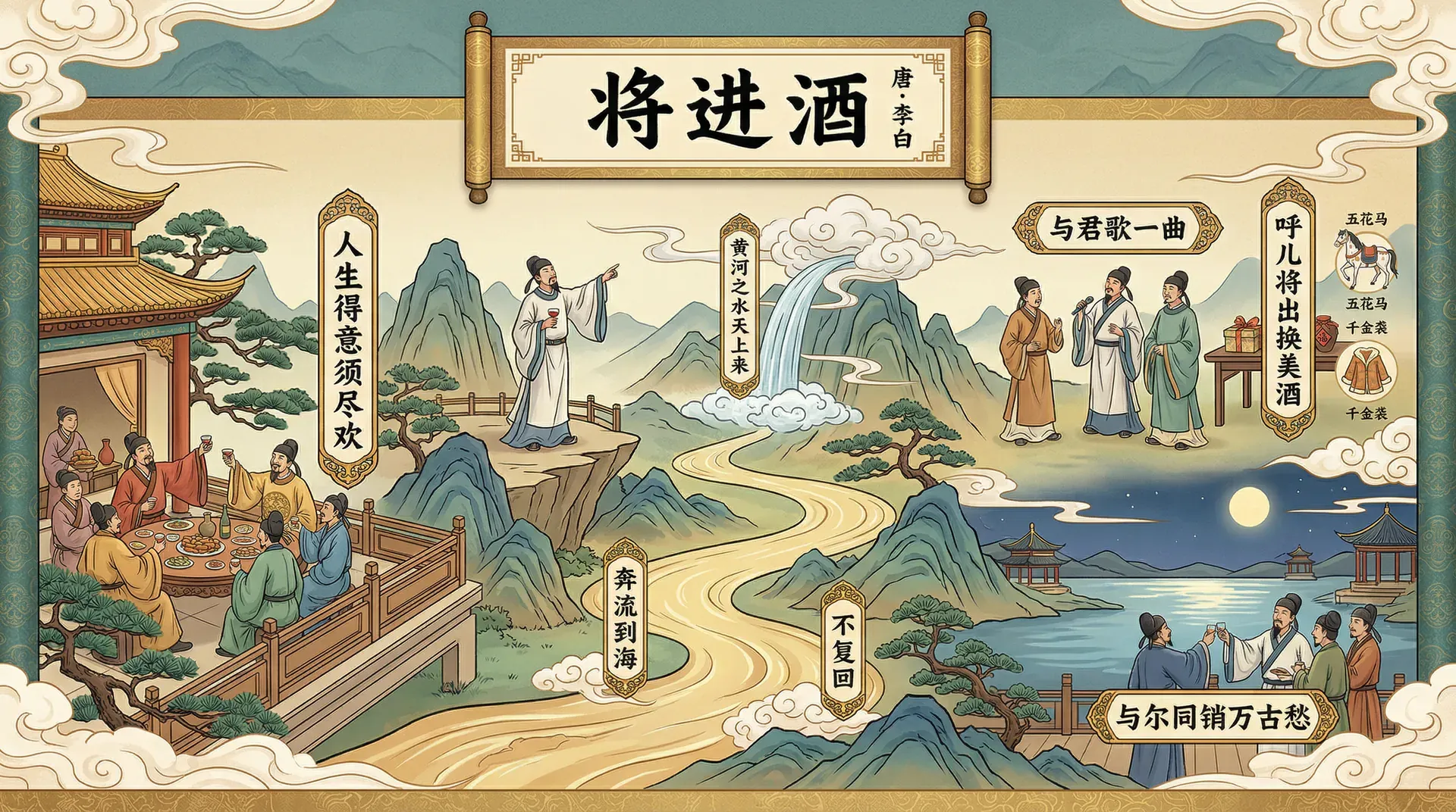 将进酒“将”在此处读 qiāng,是“请”的意思,相当于劝酒时说“来,喝吧”。整个题目的意思是“请君饮酒”,出自汉乐府旧题,李白借旧题抒新情。