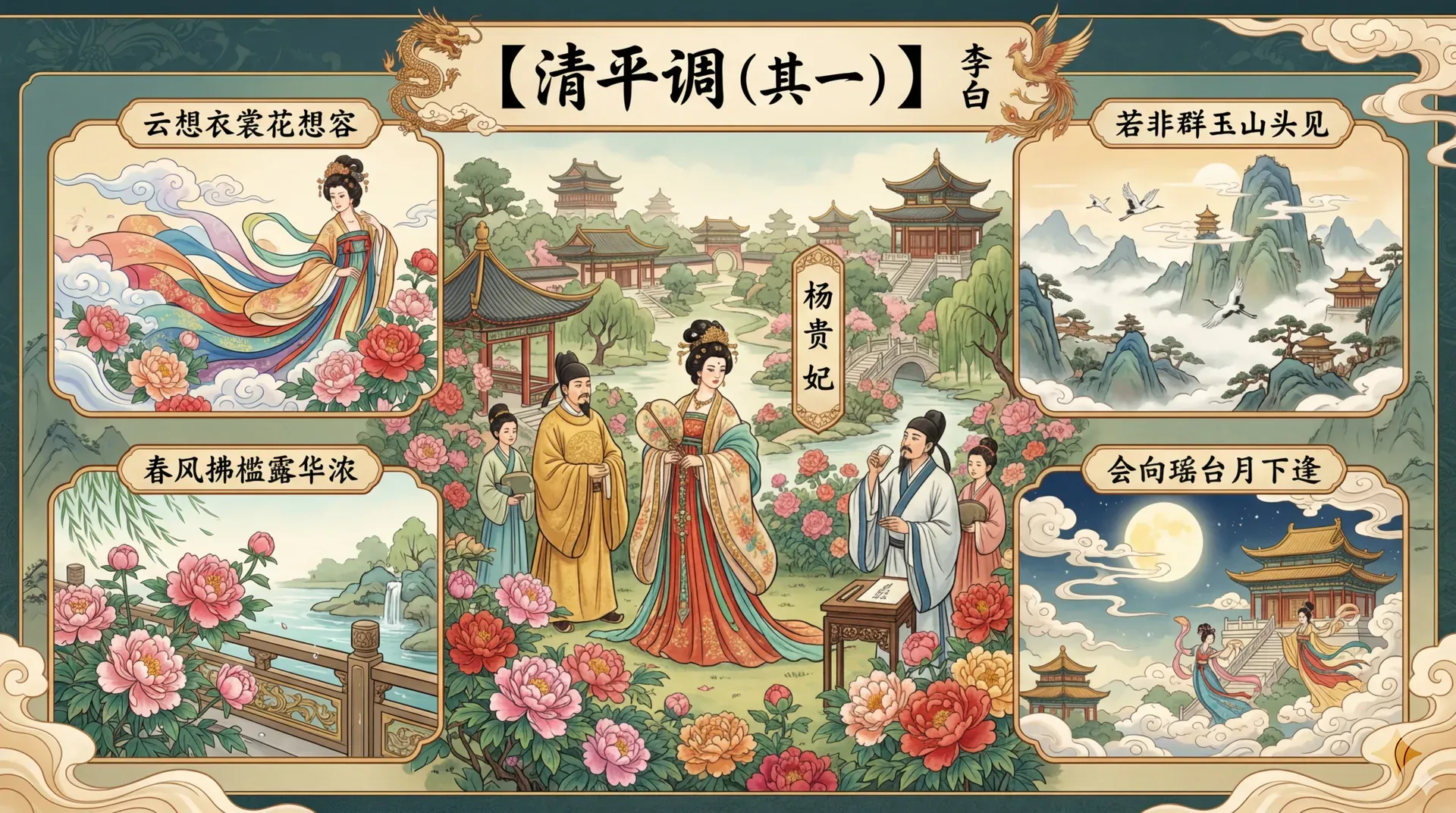 唐玄宗天宝二年(743年)暮春时节,兴庆宫内的牡丹次第开放,色如胭脂,香气馥郁。玄宗携杨贵妃移驾沉香亭,命梨园弟子奏乐助兴,又遣人急召翰林供奉李白入宫,要他即席赋诗,填配新曲。李白接旨时,据说已在酒肆中饮过几盏,被人搀扶上了御车。到了沉香亭前,他醒了几分酒意,定神看了一眼亭边盛开的牡丹,又侧目望了望妆容华美、立于花丛间的贵妃,心下有了计较,随即铺纸提笔,一气写下三首《清平调》,这是其中的第一首。