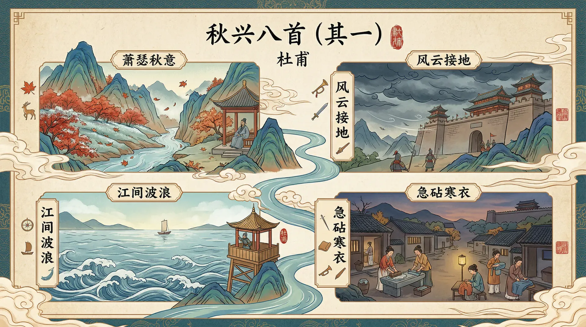 夔州地处长江三峡入口,四周山势险峻,云雾终年萦绕,入秋之后更是江风凛冽、阴云压顶。这一年深秋,诗人登高远望,满目枫叶凋零、江水滔滔,触景生情,积郁已久的思乡之情与忧国之念一齐涌上心头,于是提笔写下了“秋兴八首”。这组诗共八首,以夔州秋景为引,由眼前所见延伸至对故都、故人的深沉追忆,历来被誉为杜甫七律中的压卷之作,而本篇作为第一首,起到总领全组、奠定基调的作用。