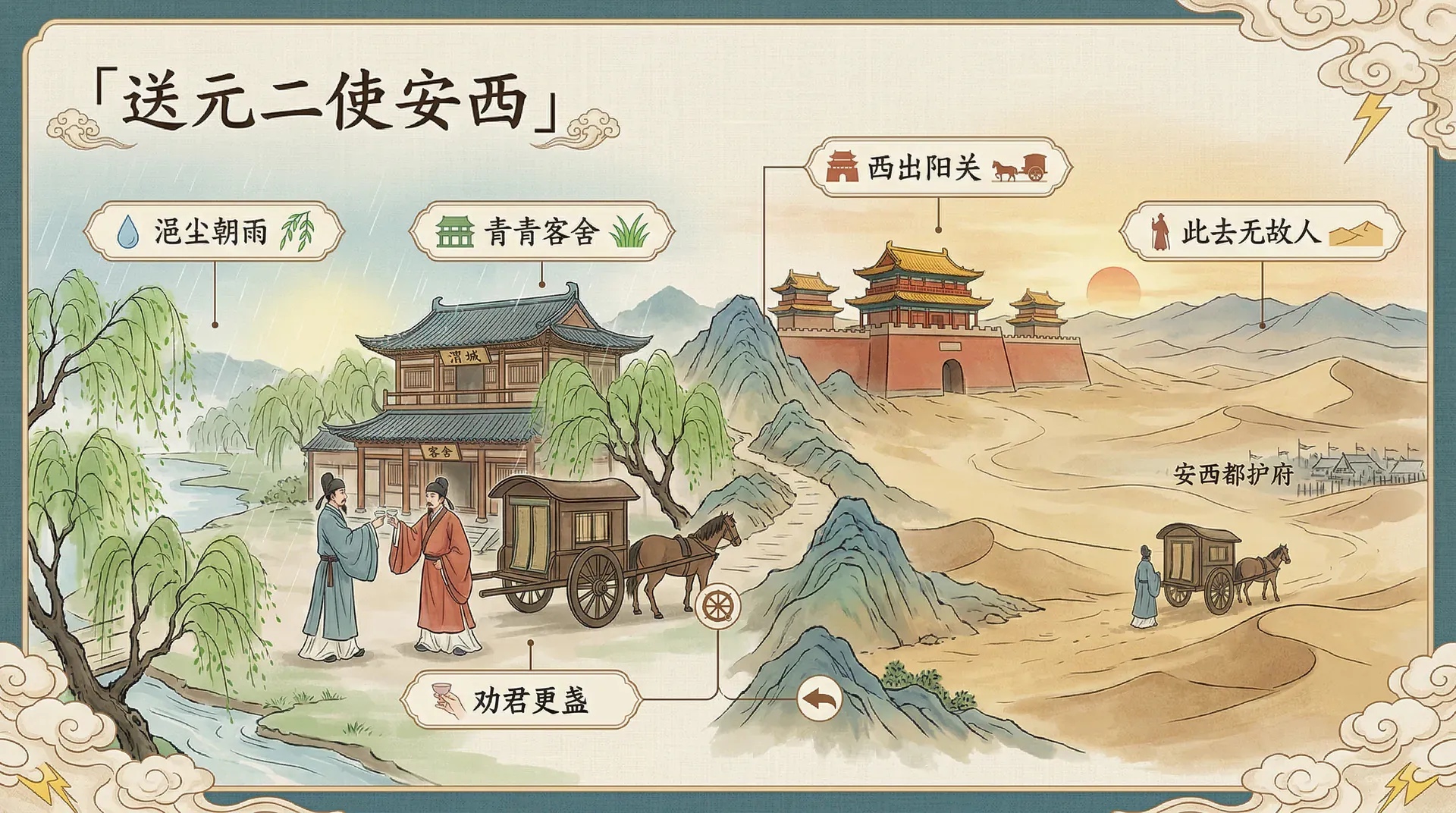 这首诗的写作时间,学界至今没有定论,多数人倾向于将它归入唐玄宗天宝年间(约公元741年至755年之间)。那个年代,唐朝国力正值鼎盛,丝绸之路上商旅络绎不绝,西域与中原之间往来频繁,不少官员奉命出使边地或赴任西域各地。诗题中的“元二”,是王维的一位友人,真实姓名已无从查考,“二”是他在兄弟中的排行,古人相互之间惯以排行代称,并不显得生分,反而带着一种亲近随意的意味。这位元二此番奉命前往安西,也就是今天新疆库车一带的安西都护府,那是一处距长安数千里之遥的边陲要地,山高路远,去了便不知何时能归。