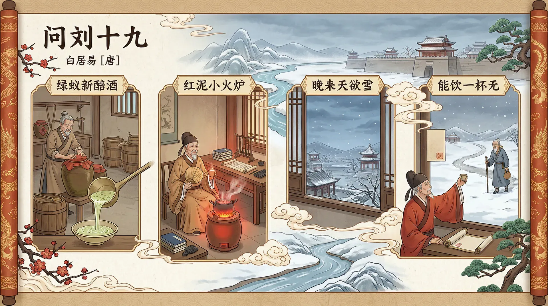 那是一个冬日的傍晚,天色渐暗,云层压得很低,空气里透着那种雪将落未落的凉意。白居易在家中生好了炉火,温上了一壶新酿的米酒,想起住在附近的刘十九,便随手写下这首小诗,差人送去相邀。